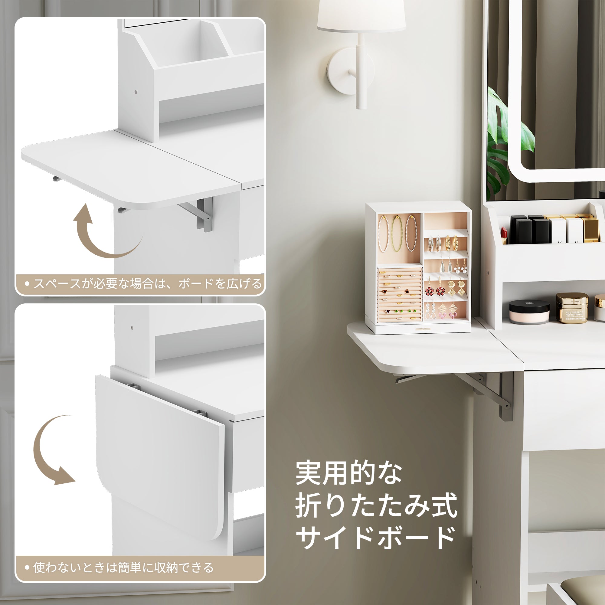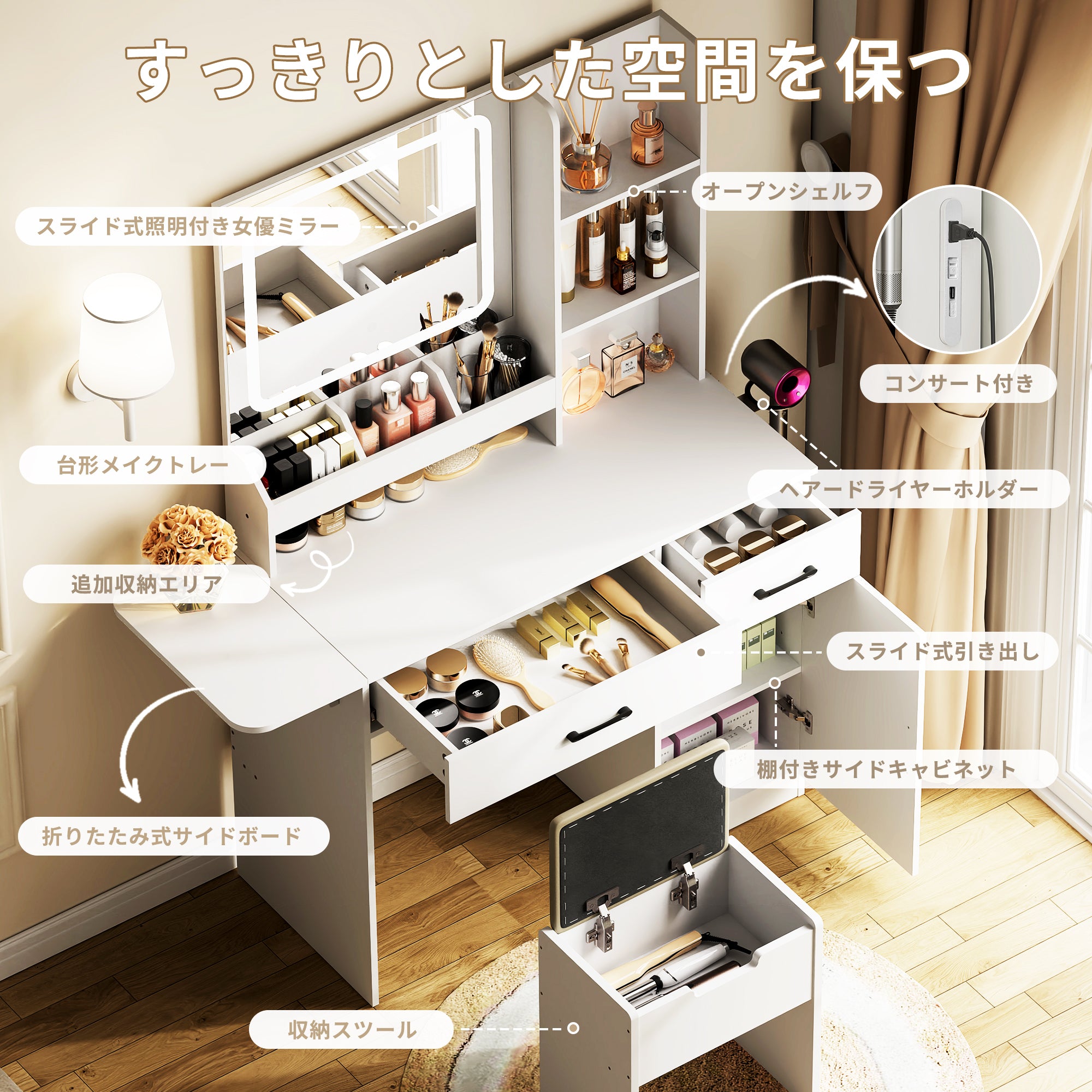 - 【さまざまなシーンに適応】多機能なこのメイク台は、さまざまなシーンで活躍します。オープンシェルフ、充電コンセント、USBポート、ドライヤーホルダーを備えており、ドレッサーとしてだけでなく、ワークスペースや浴室、寝室でも利用可能です。折りたたみサイドボードとスライド式引き出しにより、コンパクトに収納でき、必要な時に広げて使うことができます。