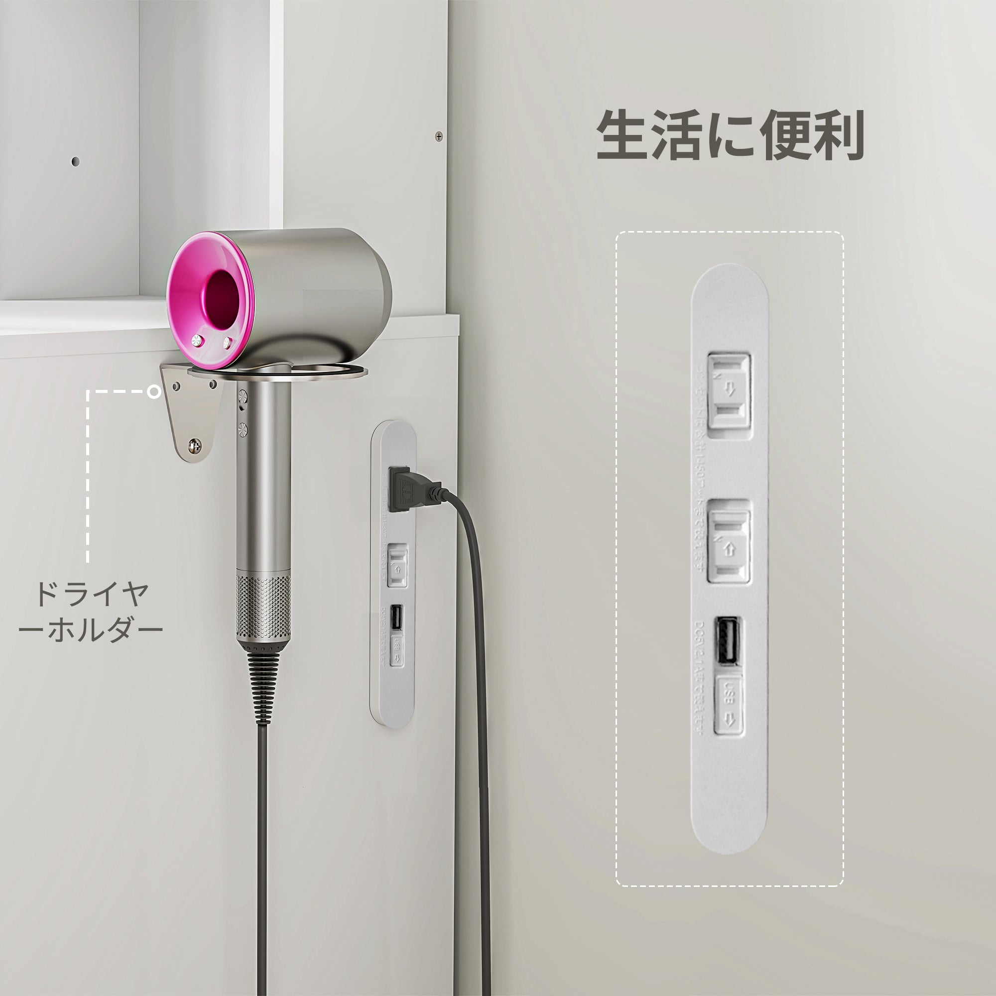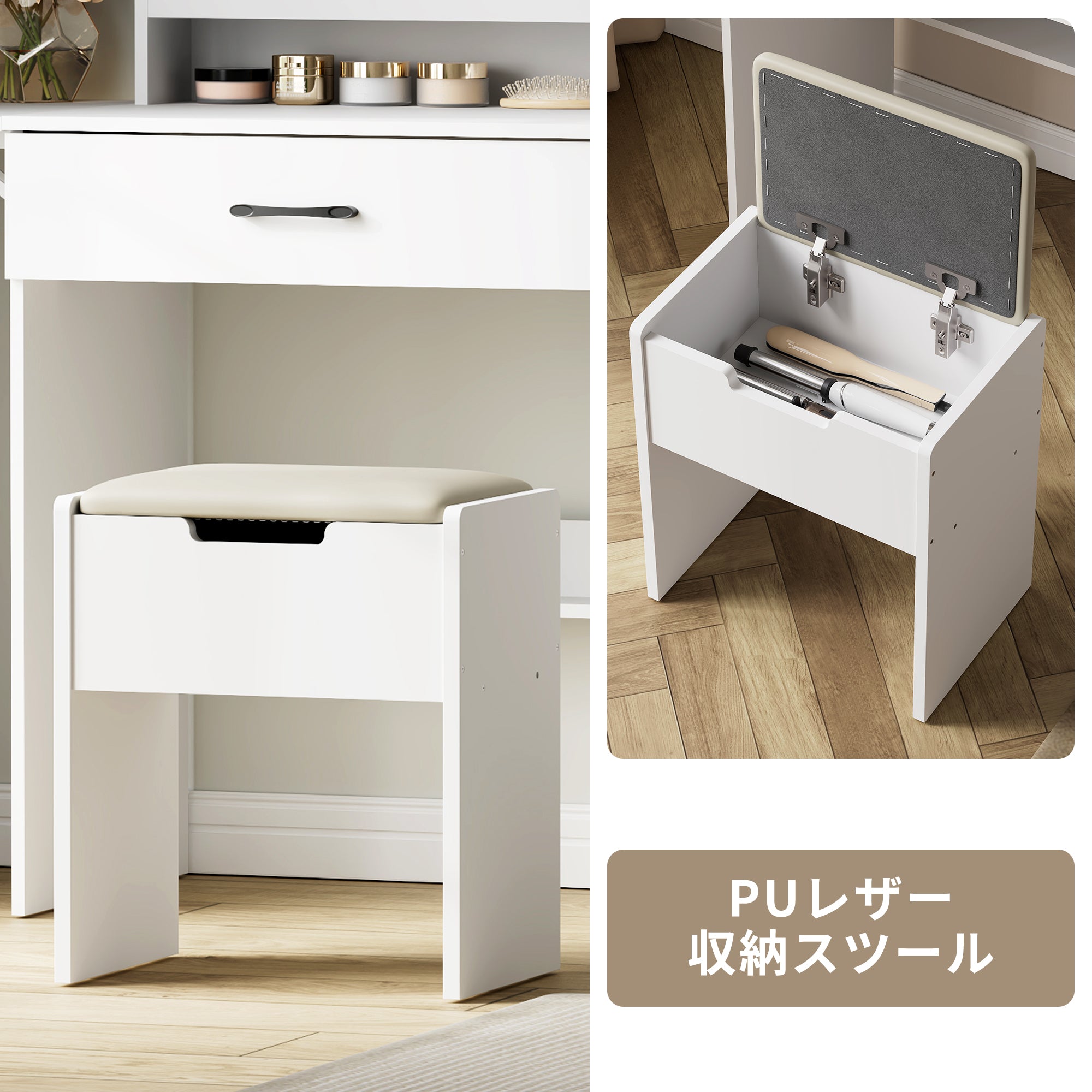 - 【細部までの心入れ】ヘアドライヤーホルダーや収納付きスツールなど、細部にまで配慮が行き届いています。使用後のドライヤーを簡単に収納できるスペースがあり、化粧台の上がすっきりと片付きます。また、収納付きスツールは、小物や雑誌などを収納できるため、さらに収納力がアップします。快適な座り心地で、長時間のメイクアップやスキンケアにも最適です。