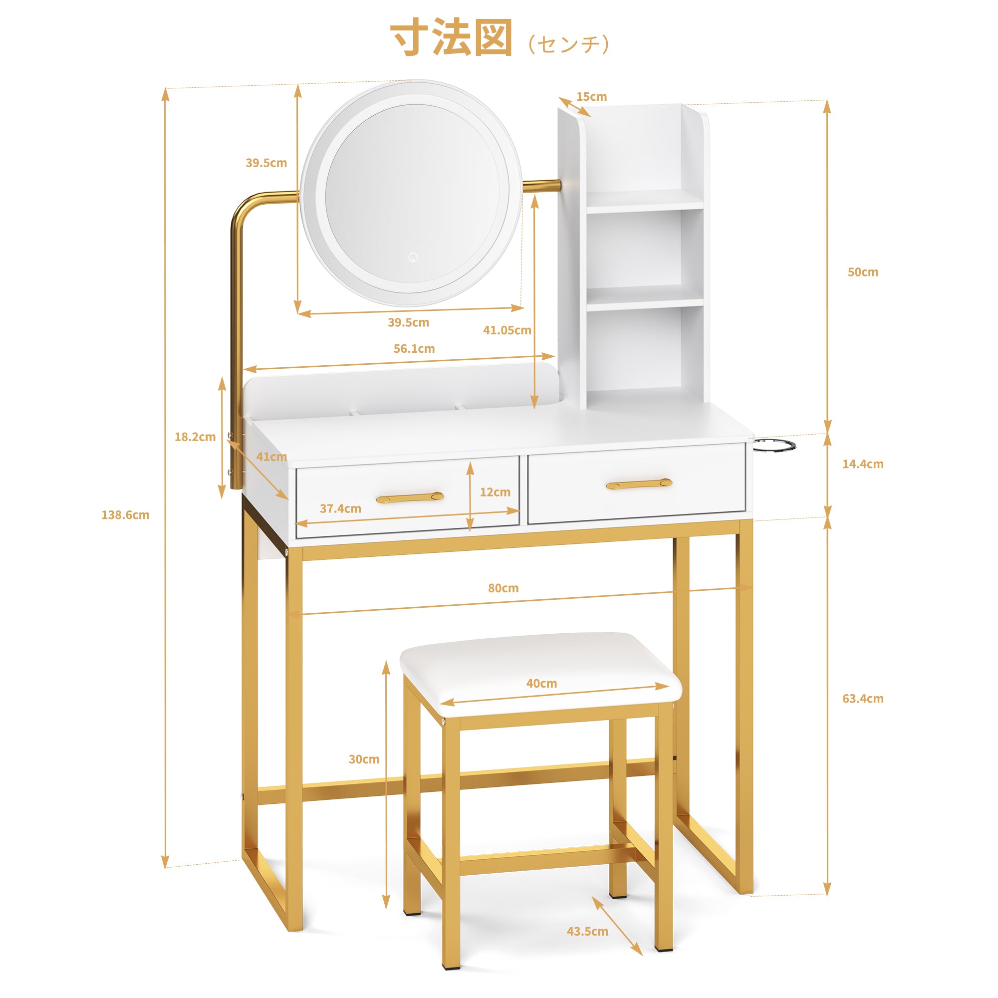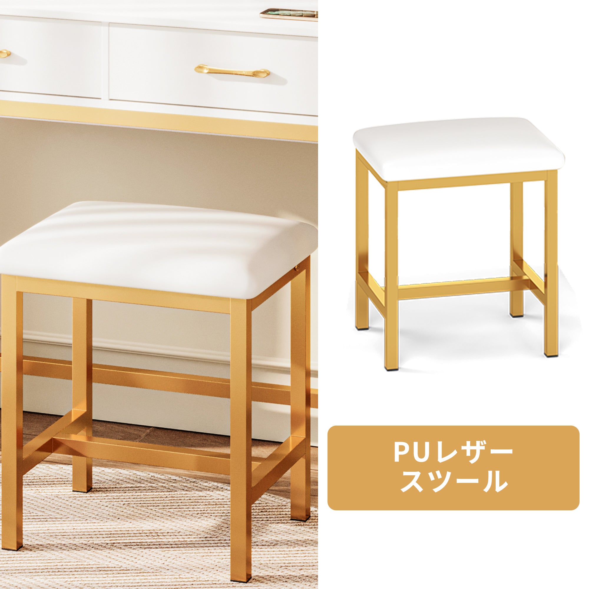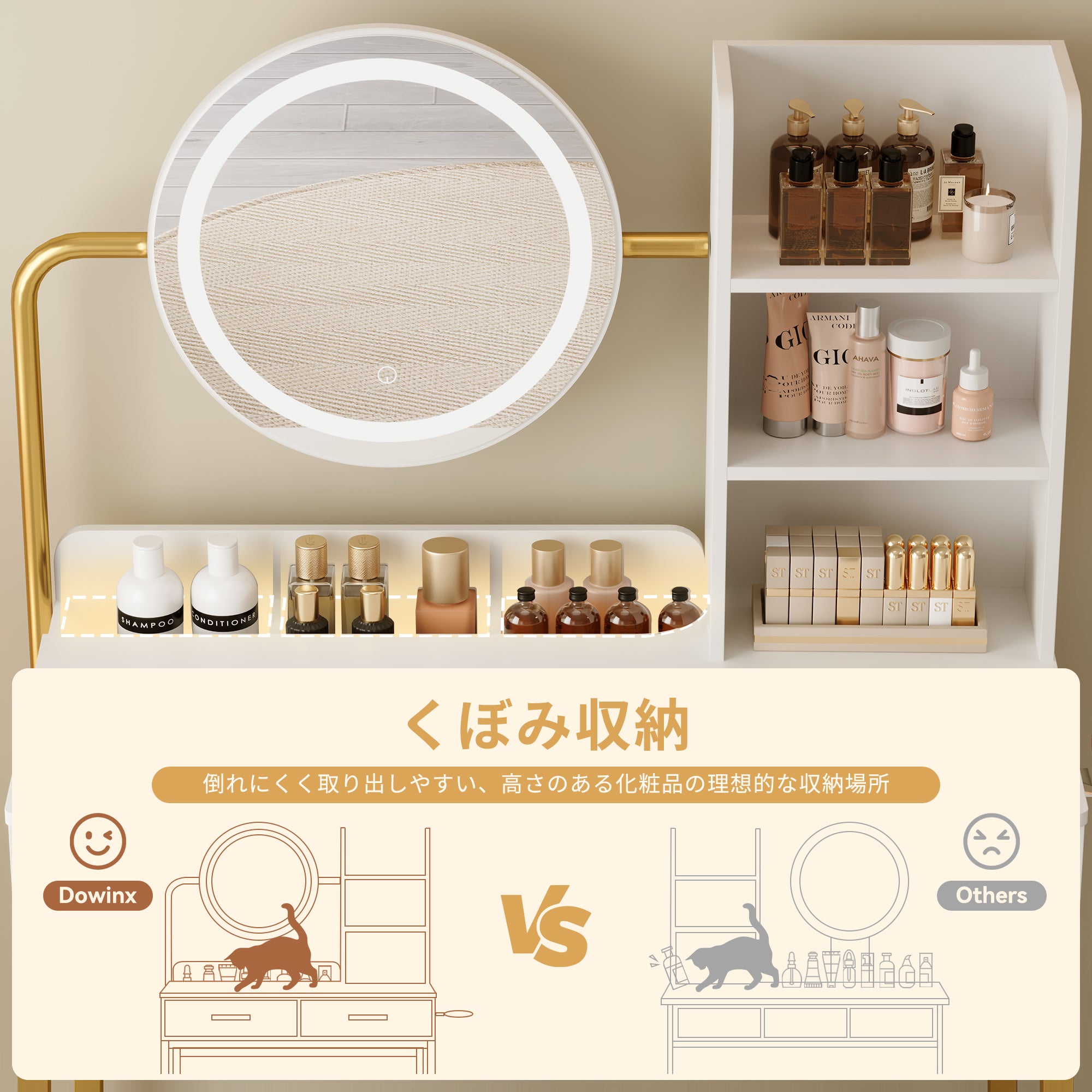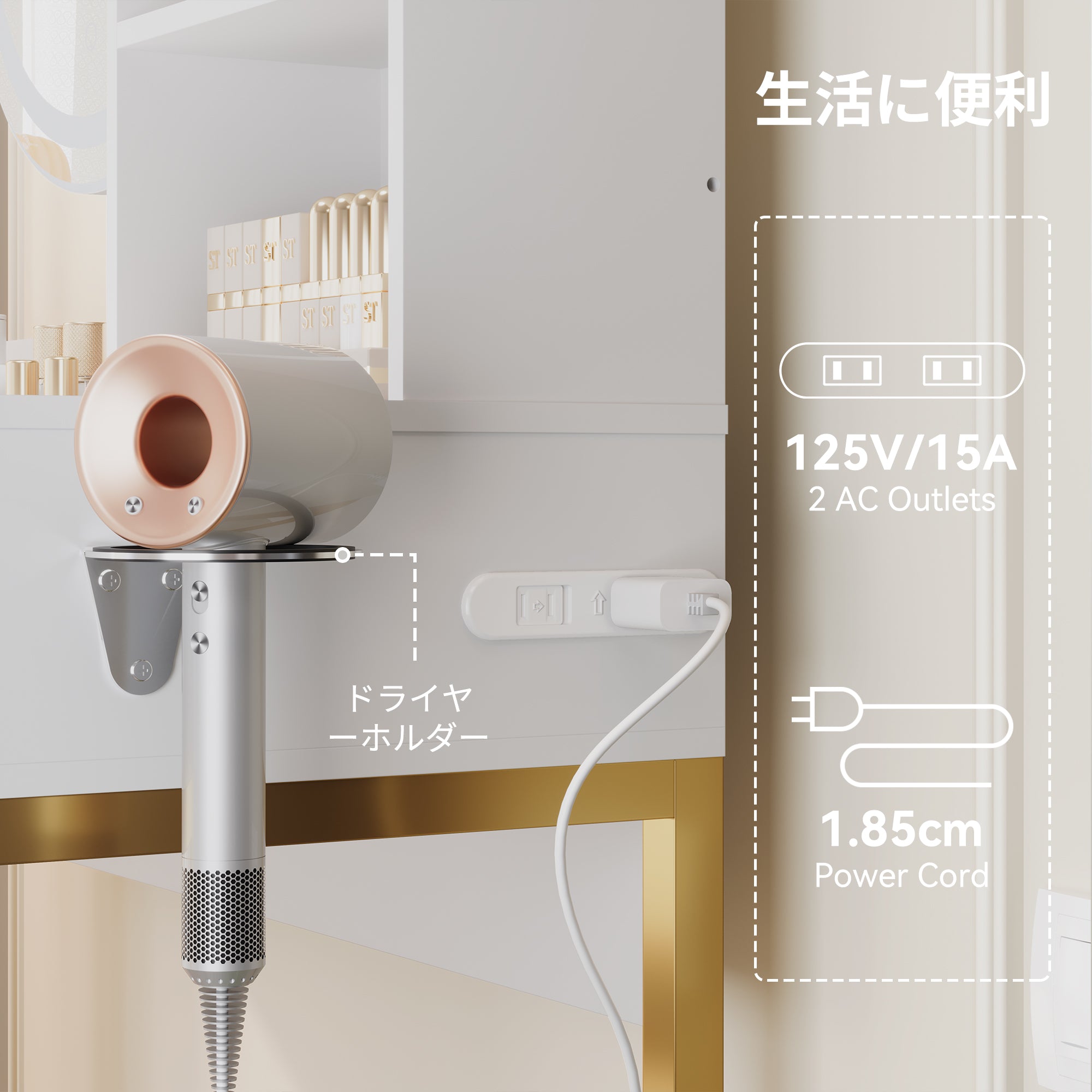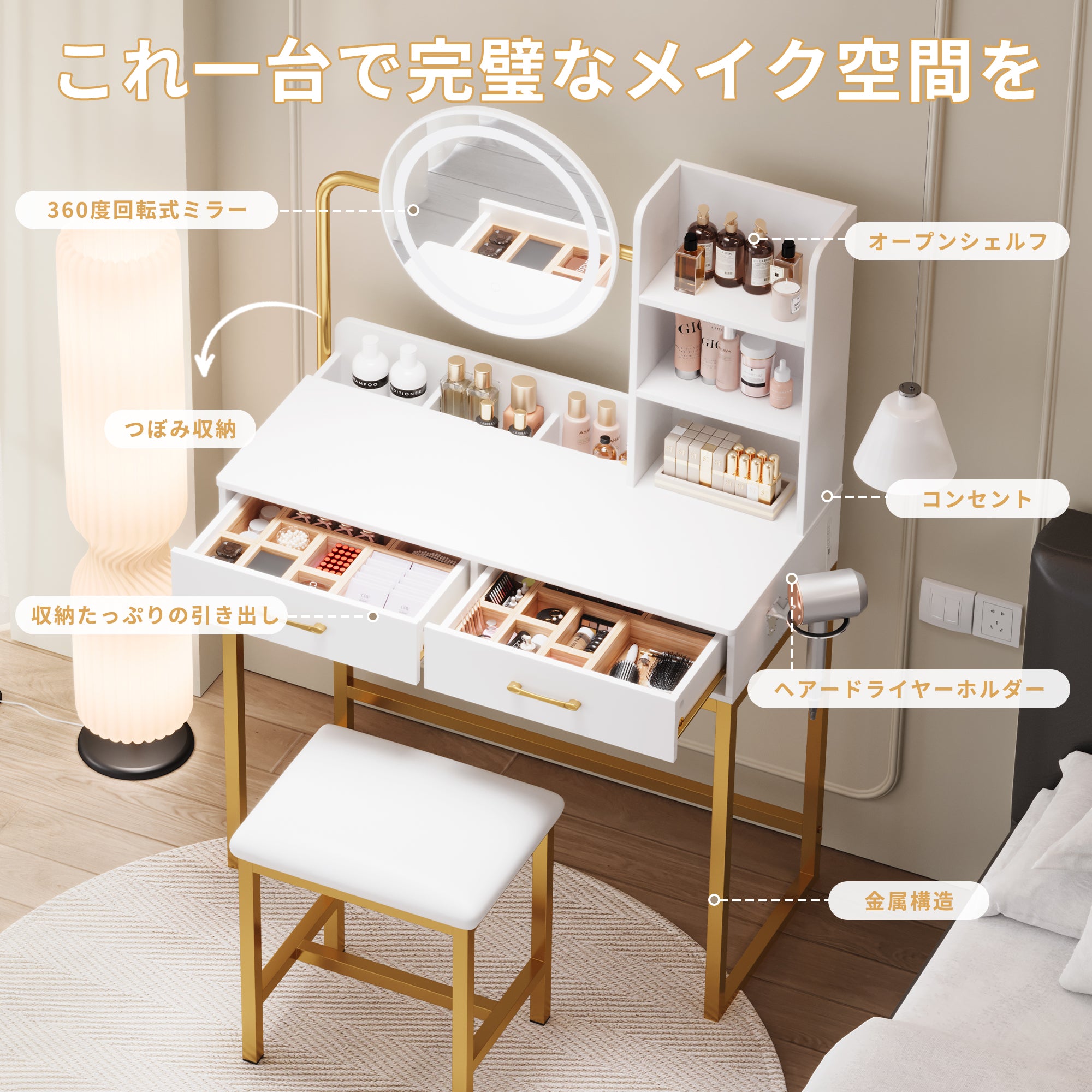 - 【細部までの心入れ】ヘアドライヤーホルダーやスツールなど、細部にまで配慮が行き届いています。使用後のドライヤーを簡単に収納できるスペースがあり、化粧台の上がすっきりと片付きます。快適な座り心地で、長時間のメイクアップやスキンケアにも最適です。