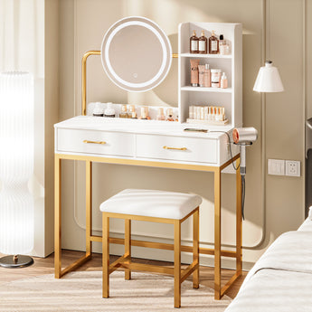 - 【さまざまなシーンに適応】多機能なこのメイク台は、さまざまなシーンで活躍します。オープンシェルフ、充電コンセント、ドライヤーホルダーを備えており、ドレッサーとしてだけでなく、ワークスペースや浴室、寝室でも利用可能です。スライド式引き出しにより、コンパクトに収納でき、必要な時に広げて使うことができます。